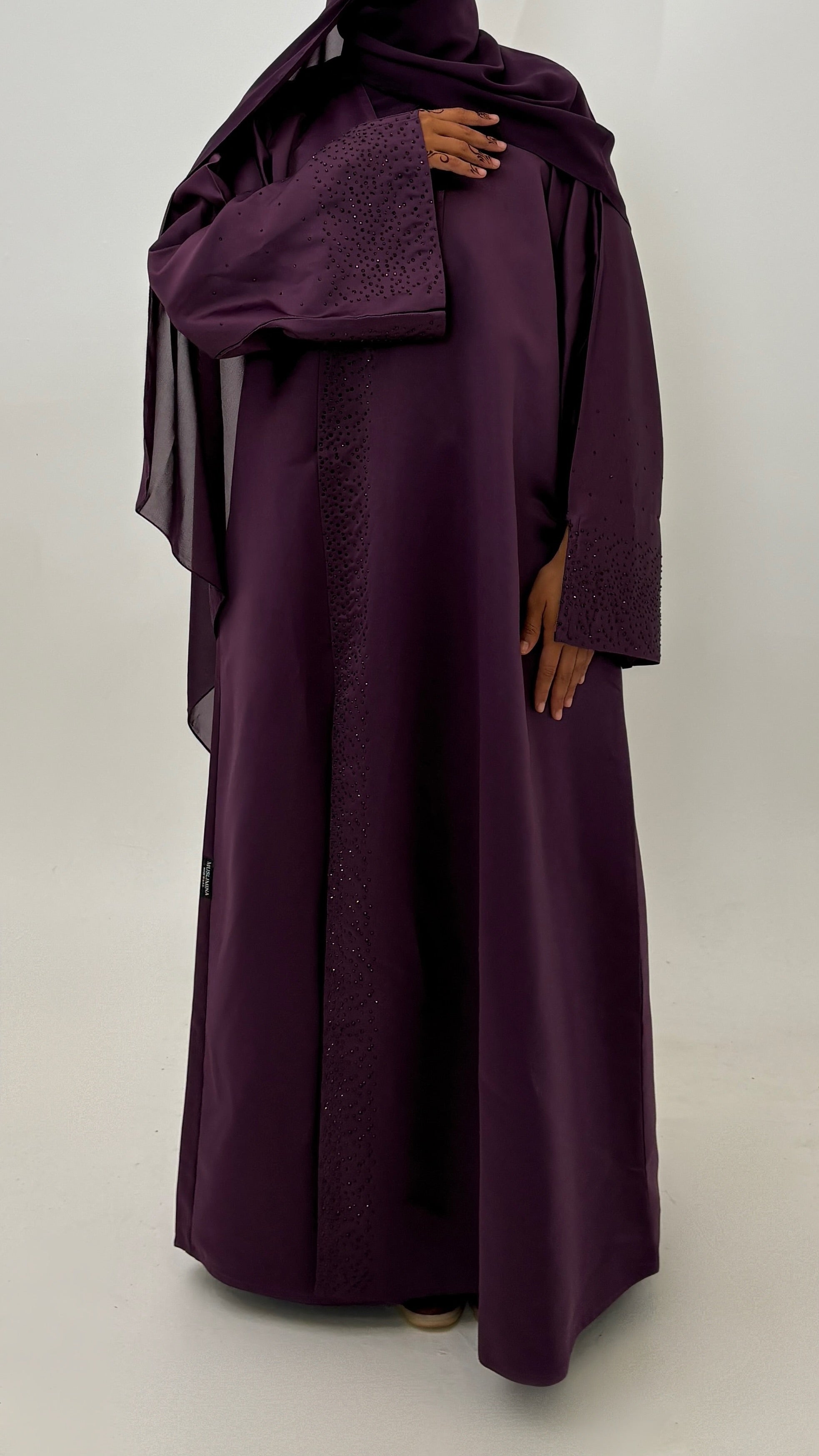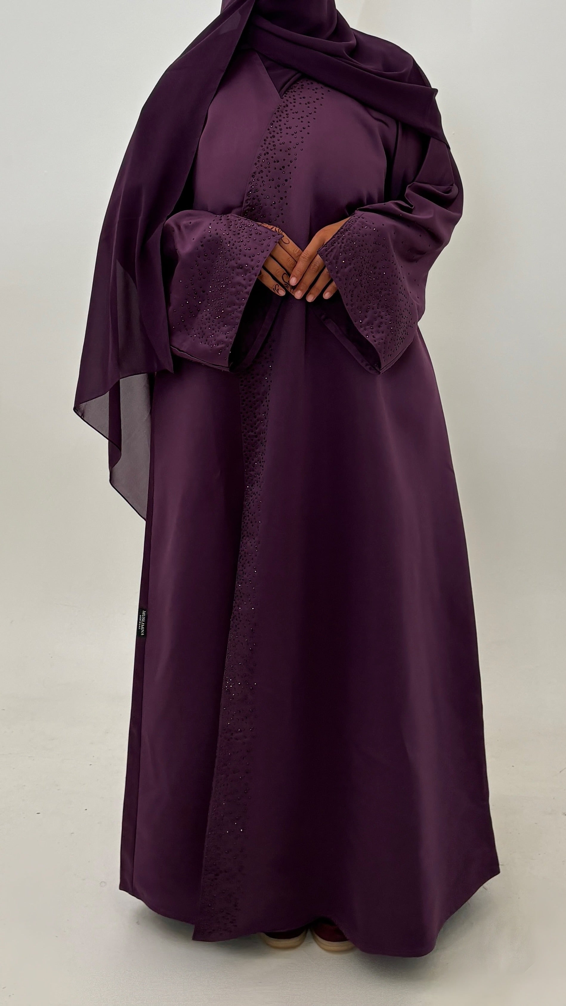 Abaya d’exception confectionnée en bridal satin, un tissu doux au tombé fluide et élégant.