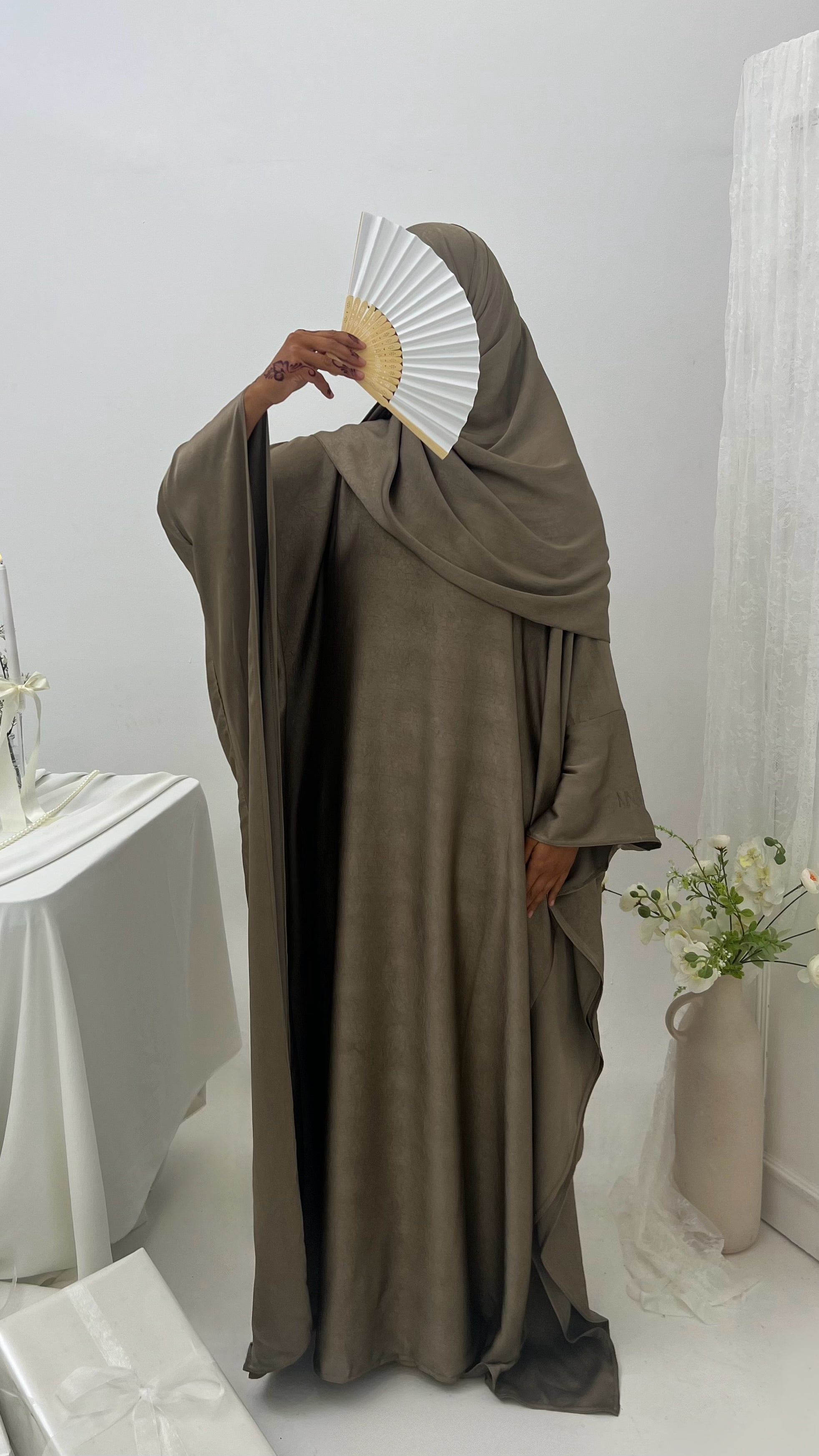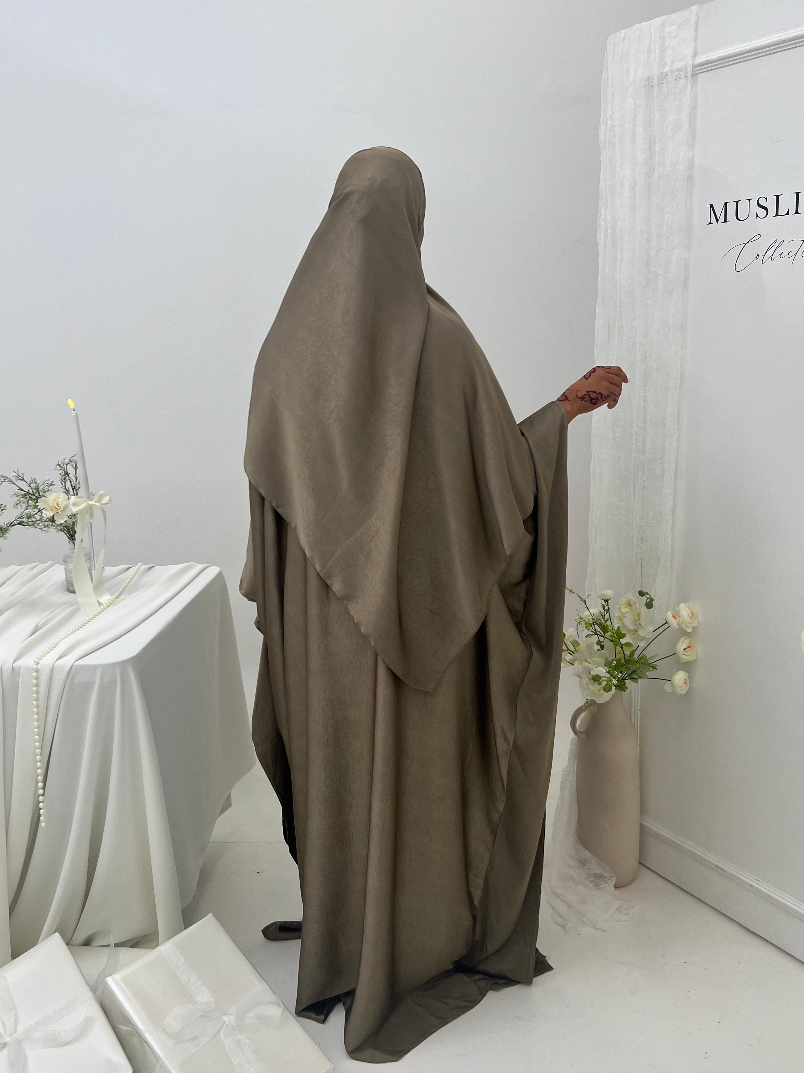 Abaya élégante avec voile assorti, confectionnée dans un satin froissé fluide et lumineux. Sa coupe ample offre un tombé raffiné, idéal pour l’Eïd et les occasions spéciales.