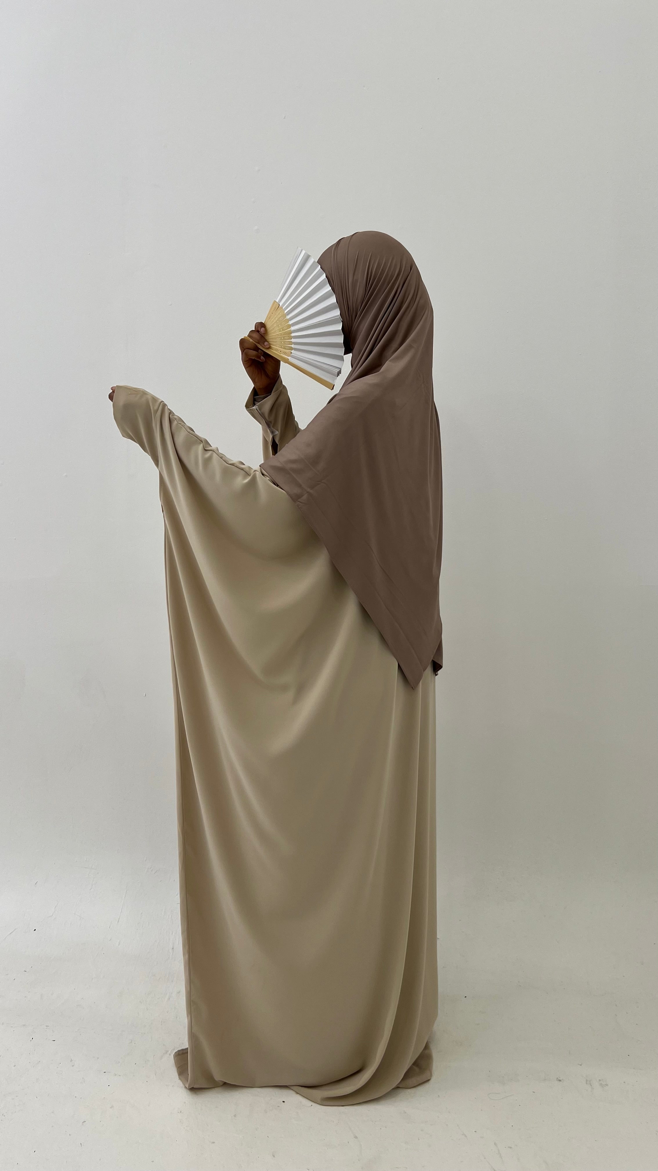 Abaya saoudienne à la coupe large et fluide, réalisée en nida coréen pour un tombé élégant.