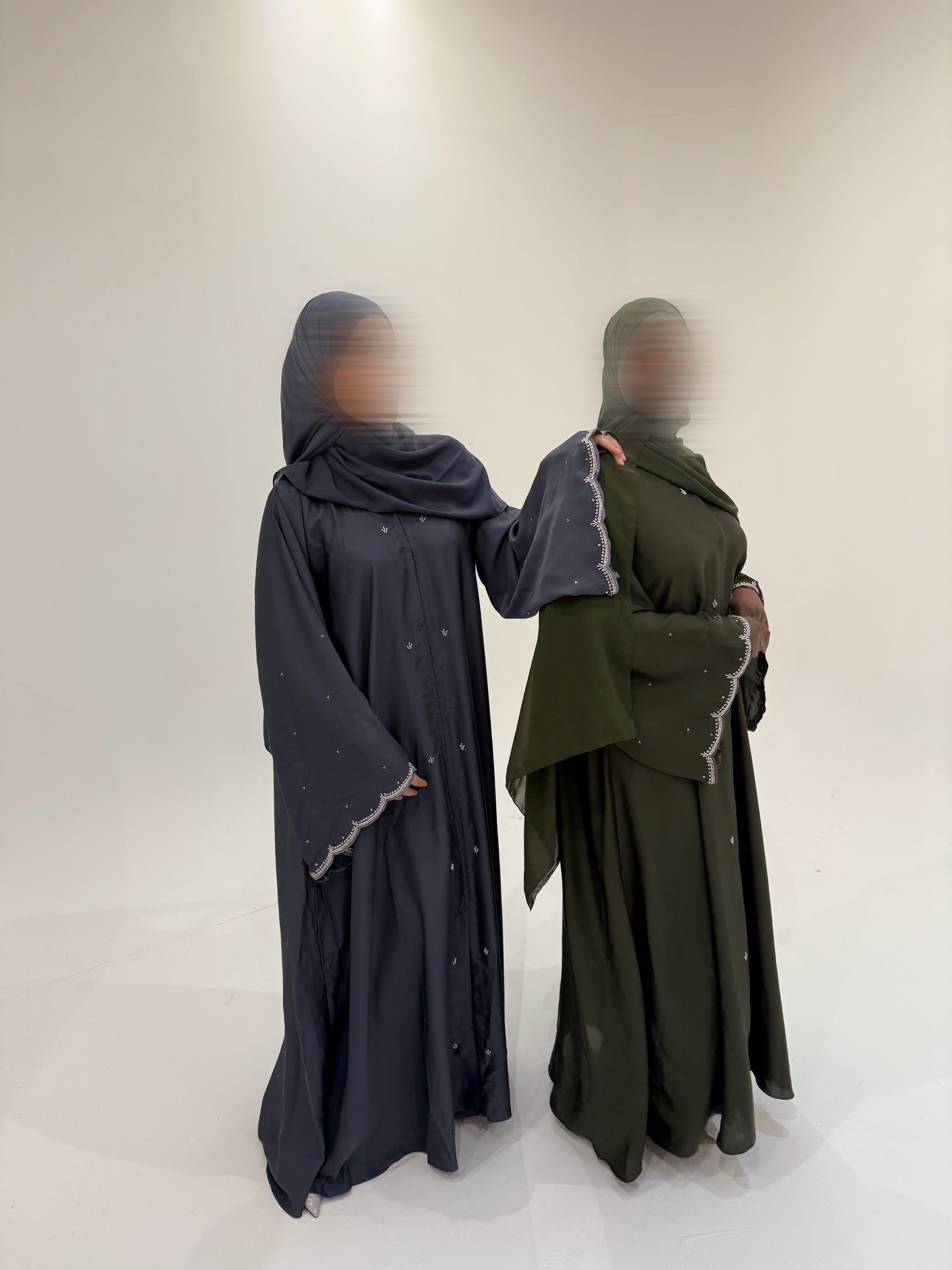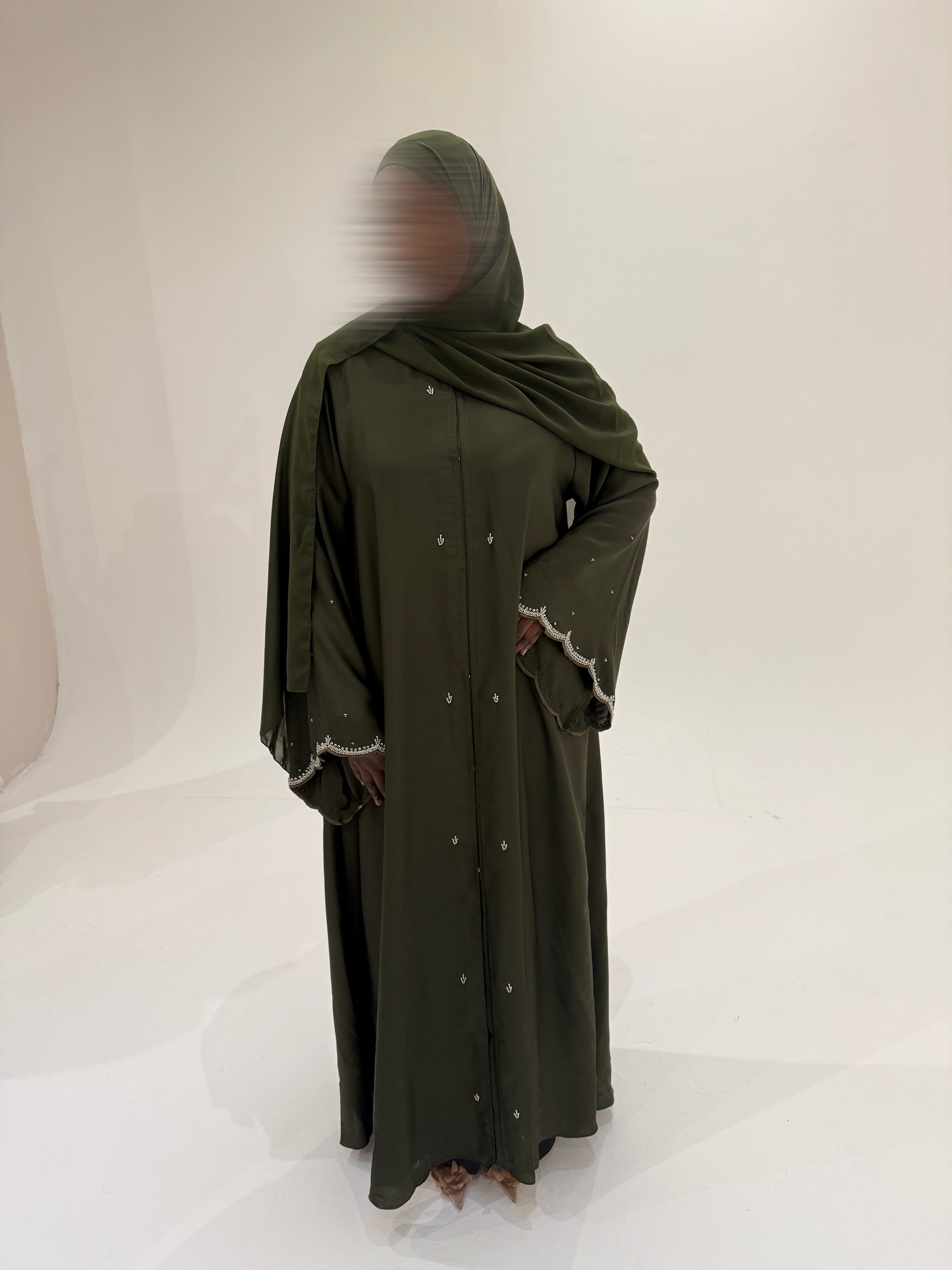 Abaya perlée à la main avec voile assorti inclus. Finitions délicates et coupe fluide, elle peut aussi se porter ouverte en kimono. Une pièce élégante et polyvalente pour vos plus belles occasions.