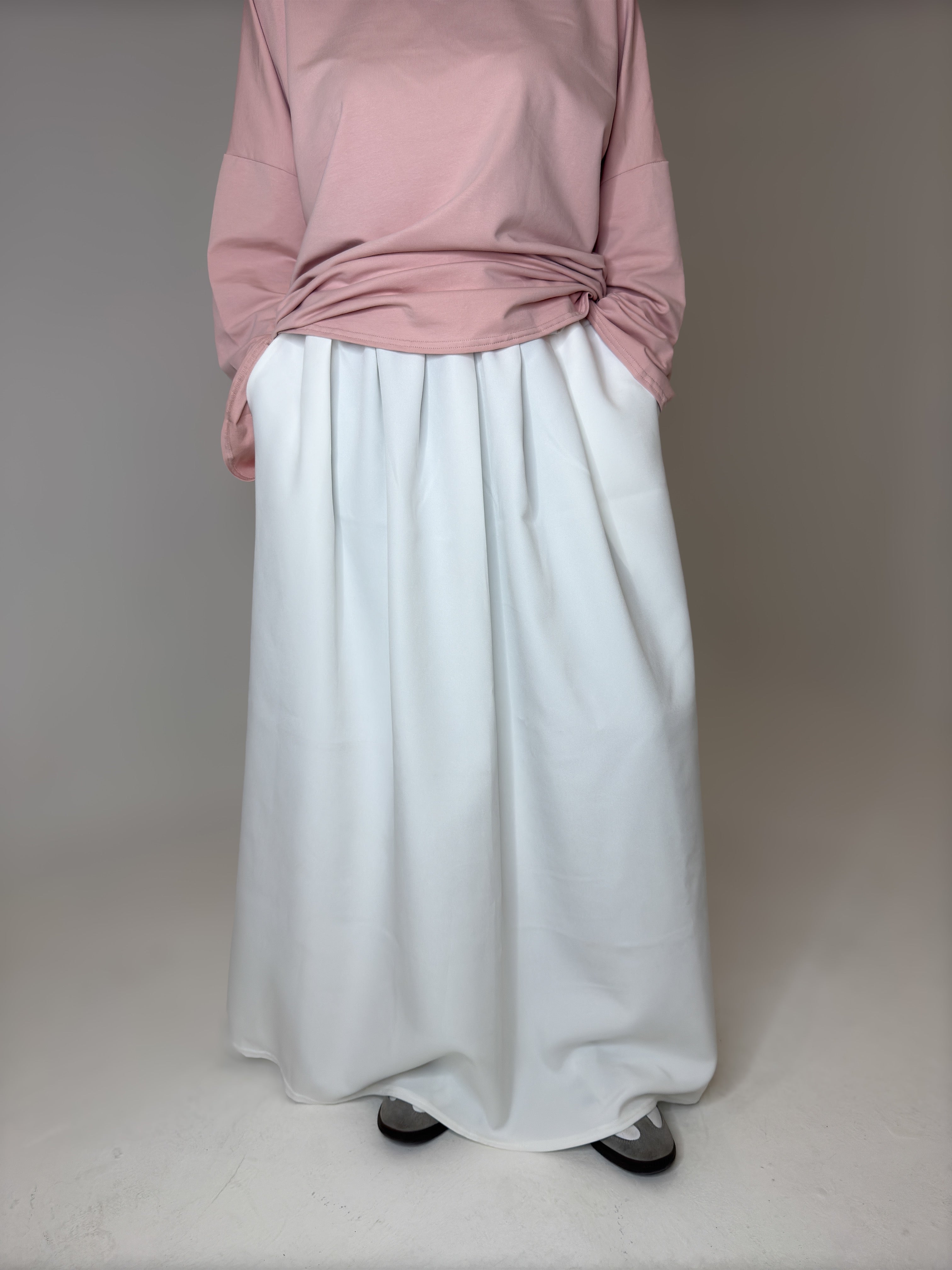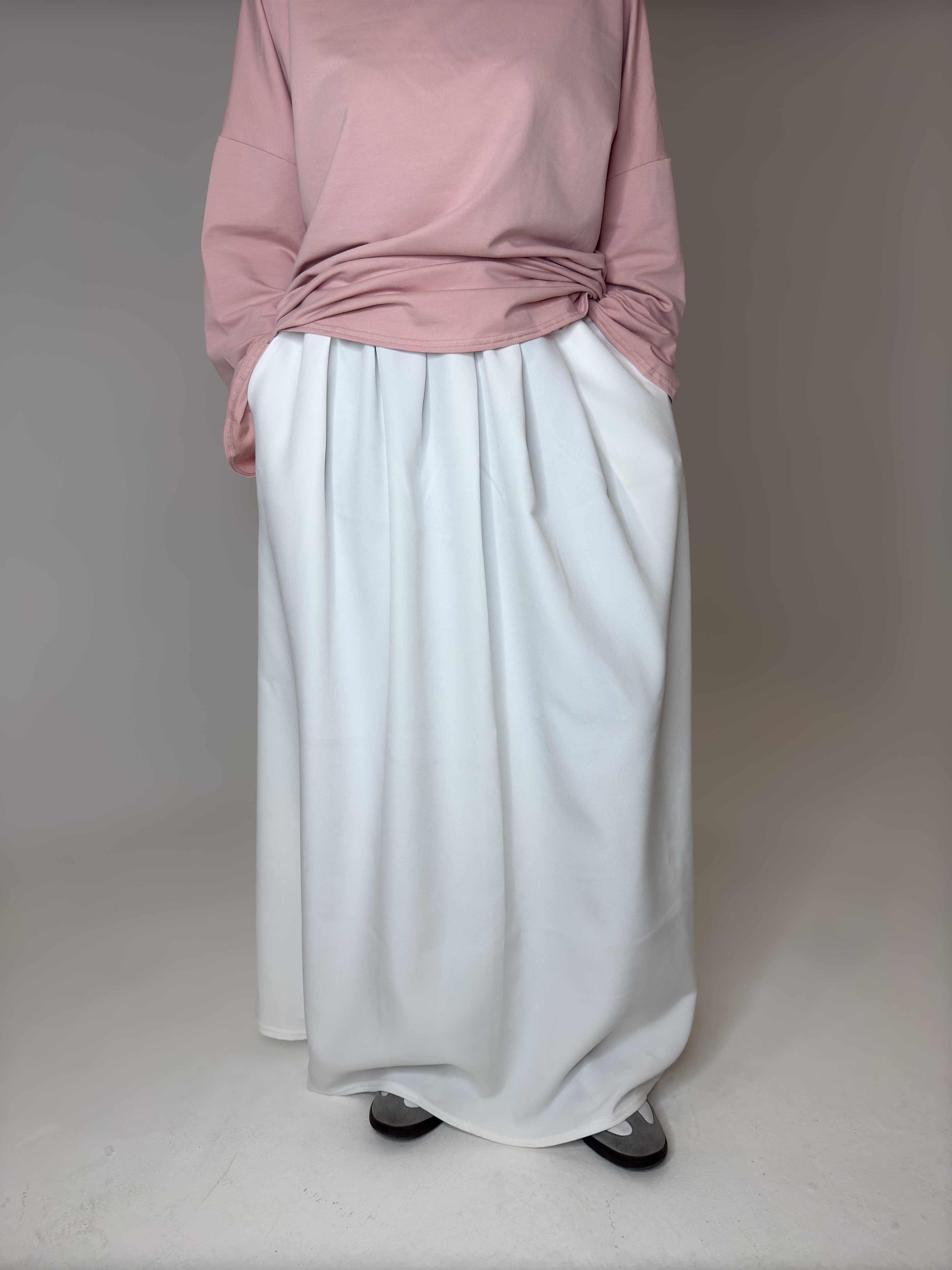 Lejla La jupe blanche est juste incroyable !! Je suis vraiment satisfaite car je lutte pour trouver des robes/jupes longues et la c’est parfait ! En plus de ça c’est bien opaque et comporte des poches. Je recommande !