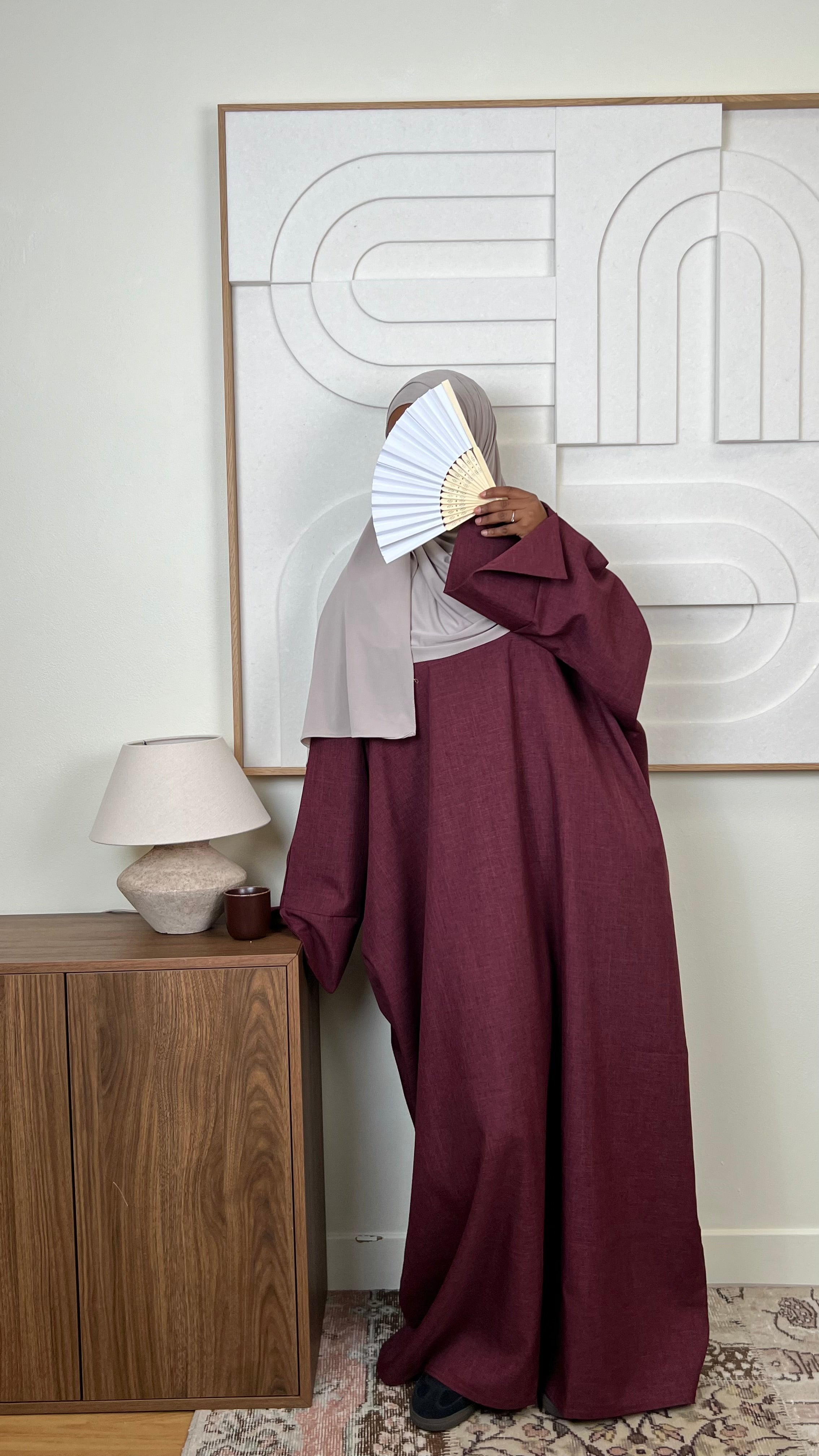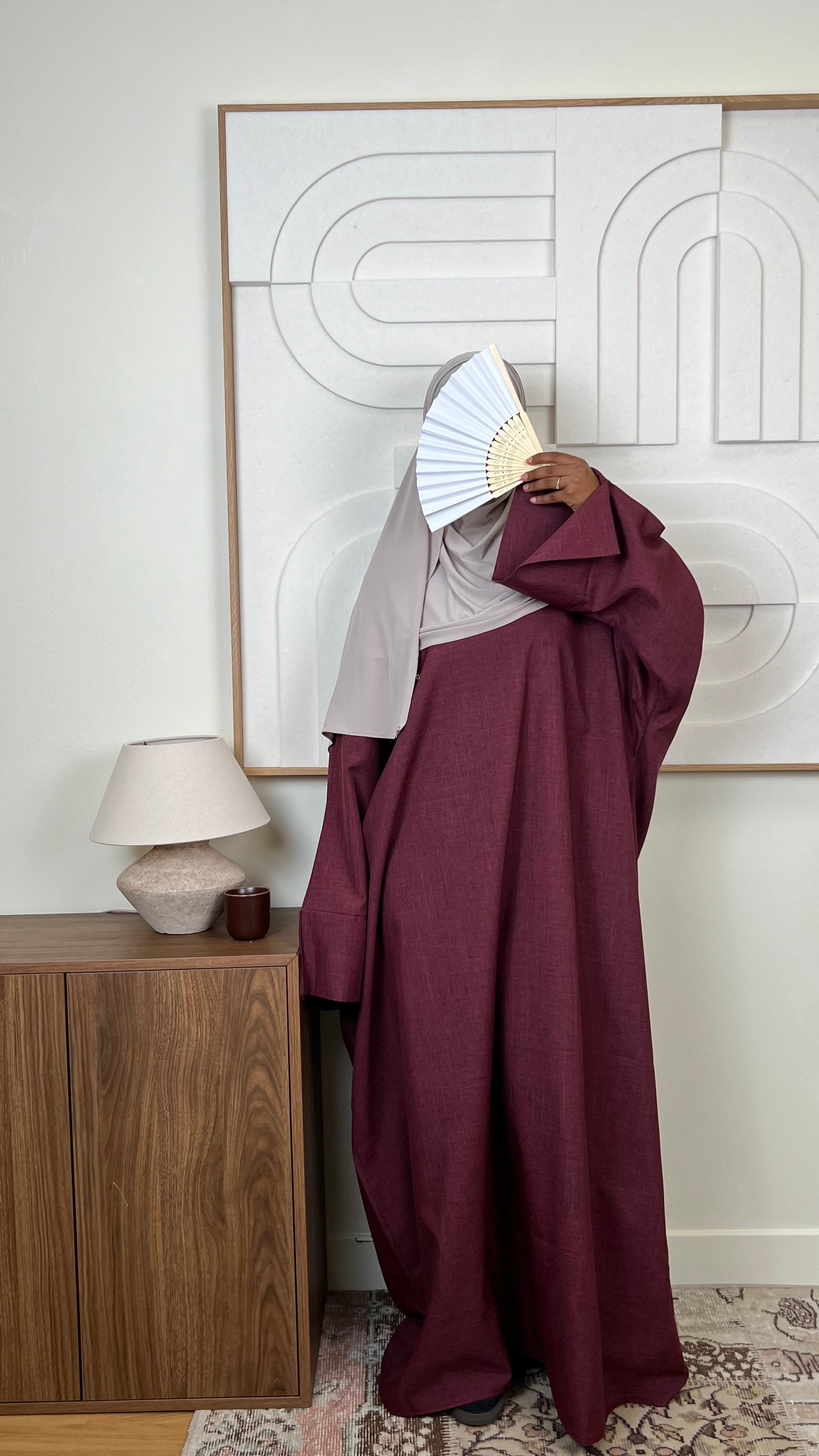 Une abaya oversize effet lin avec fente au niveau des poignets est un choix élégant et moderne.
