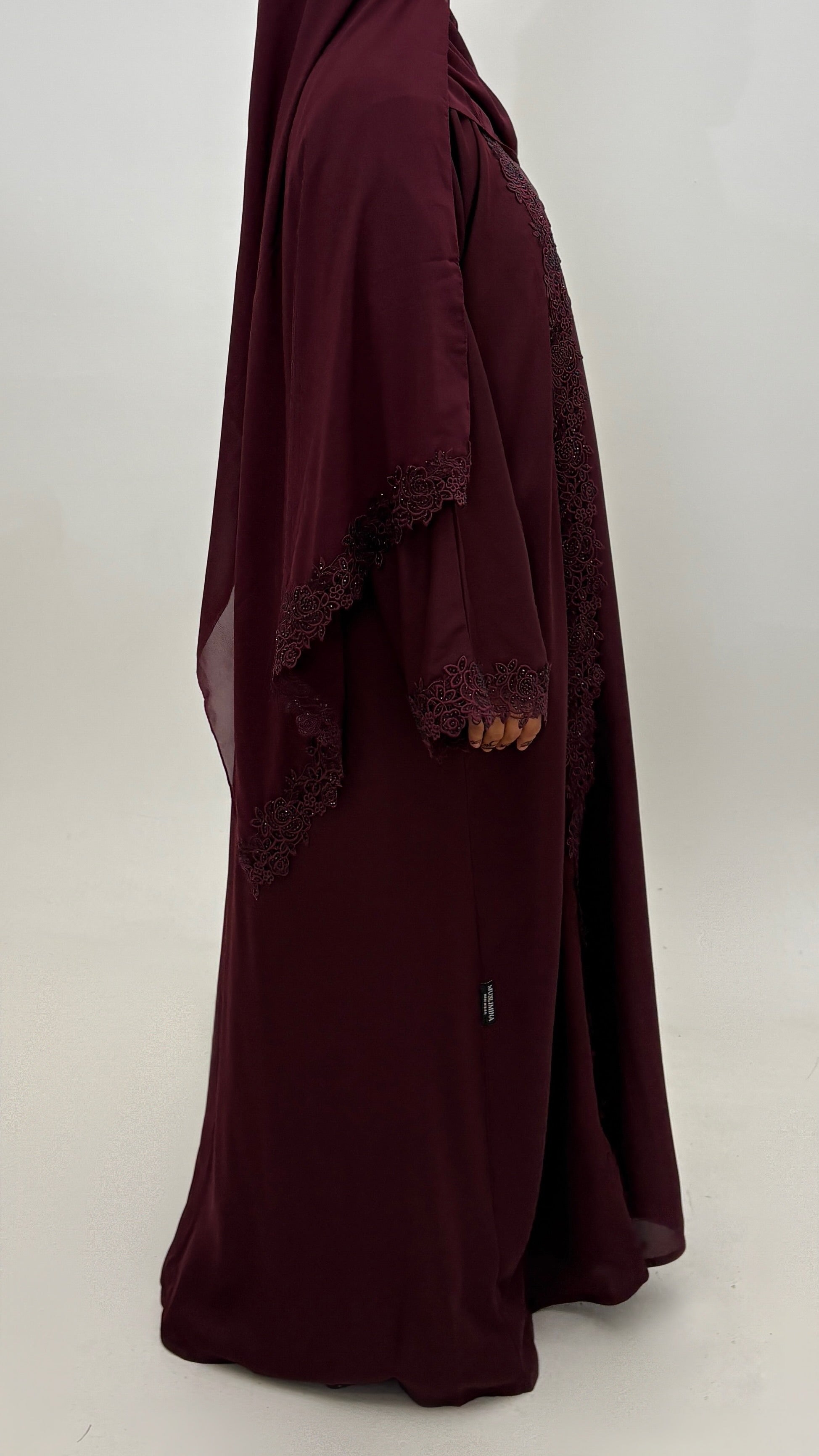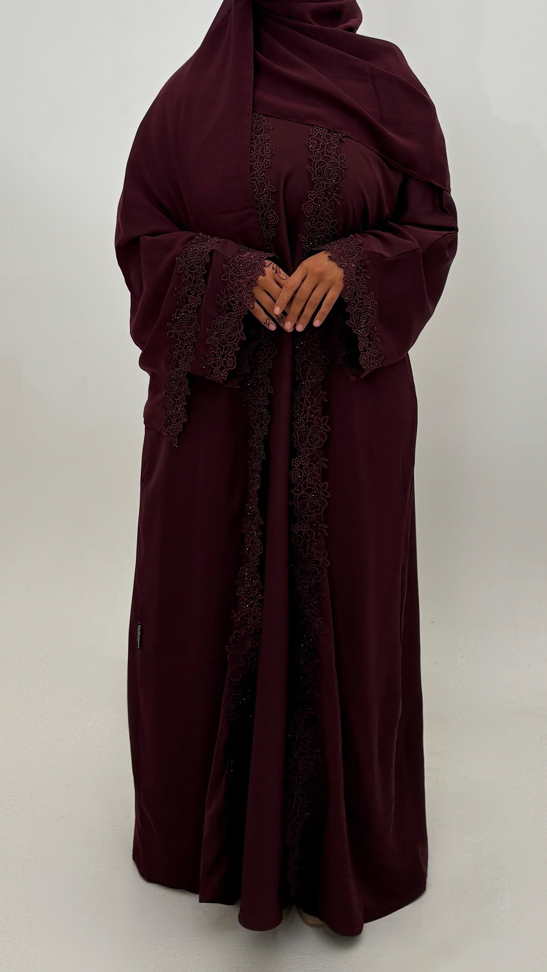 Un ensemble raffiné composé de 3 pièces : abaya manches kimono, voile assorti et robe intérieure. Sublimé par de délicates dentelles ornées de strass, il offre une allure élégante et lumineuse, parfaite pour l’Eïd et les occasions spéciales.