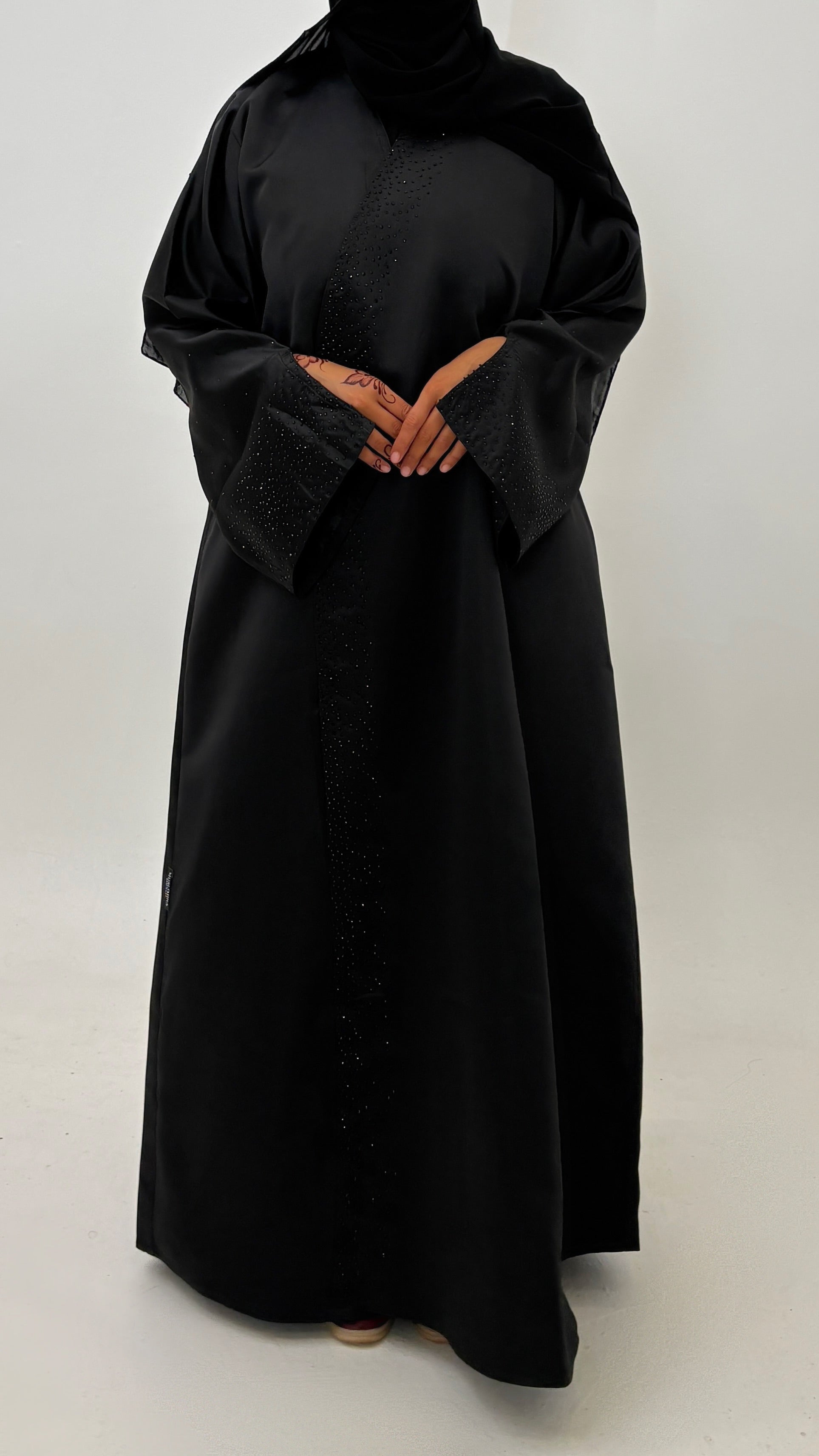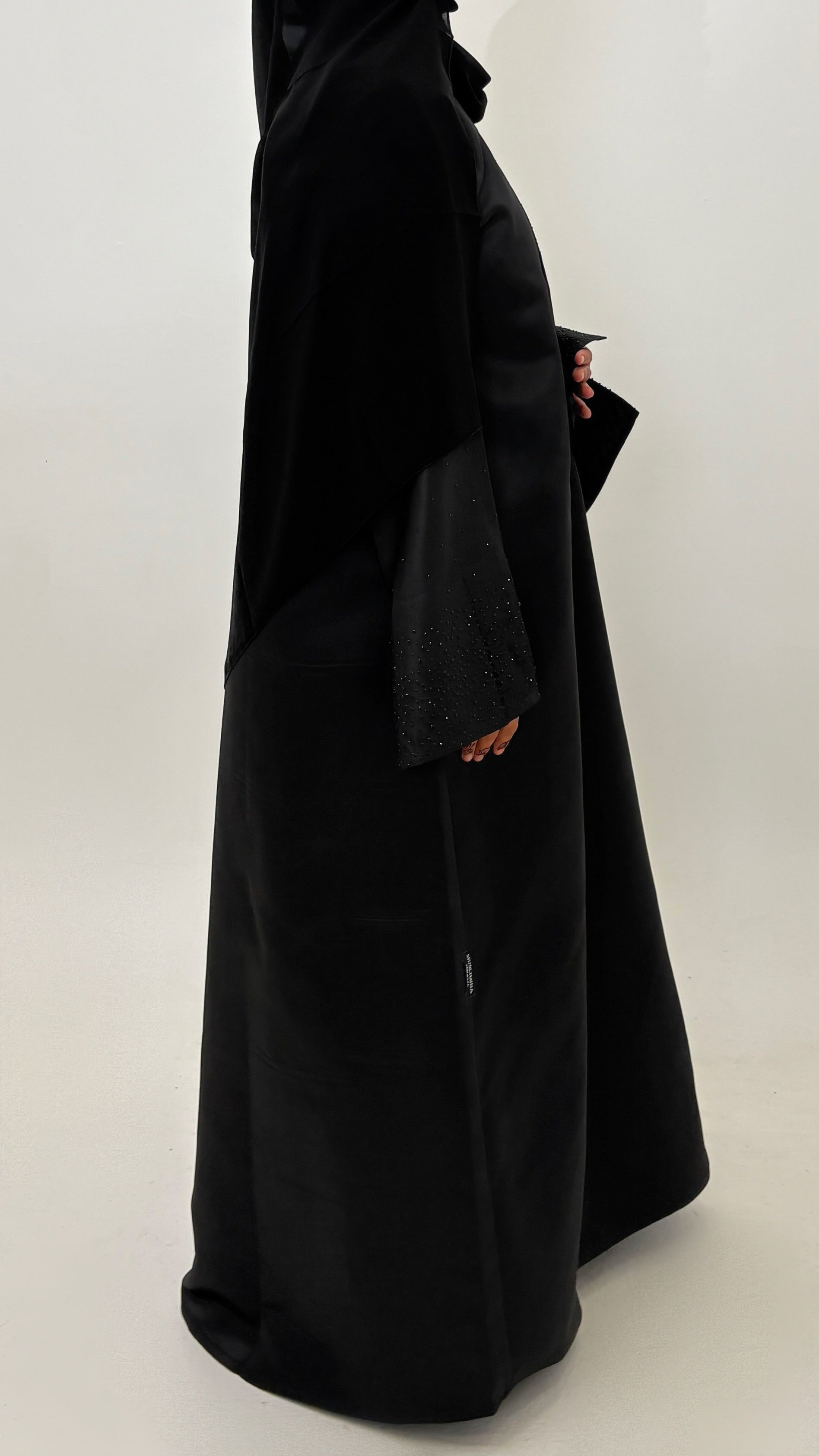 Abaya d’exception confectionnée en bridal satin, un tissu doux au tombé fluide et élégant.